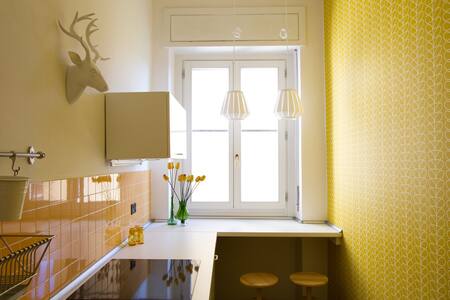 È composto da 3 oltre il bagno e un ampio ingresso. Il soggiorno è ampio con divano letto, zona studio, angolo tv e due balconcini che danno sulla facciata neoclassica. La cucina è totalmente equipaggiata per 4 persone. La camera con letto matrimoniale dispone anch'essa di un balcone