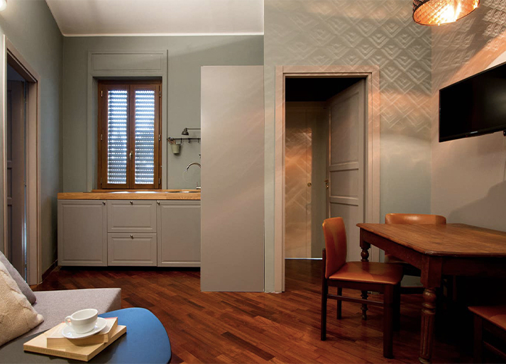 È composto dalla zona living/cucina che dispone dell'equipaggiamento completo per i pasti per 4 persone. Inoltre troverete in cucina frigo con congelatore, microonde, piastra cottura a induzione. Nella zona living un comodo divano letto doppio, un tavolo in ciliegio d'epoca e il TV