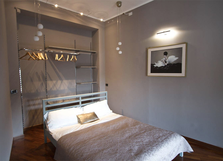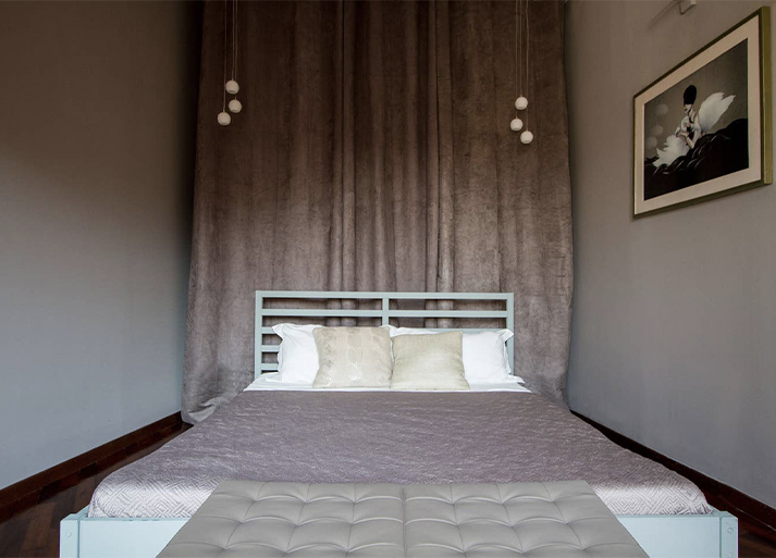 La camera da letto ha una zona cabina armadio, separata da una elegante tenda