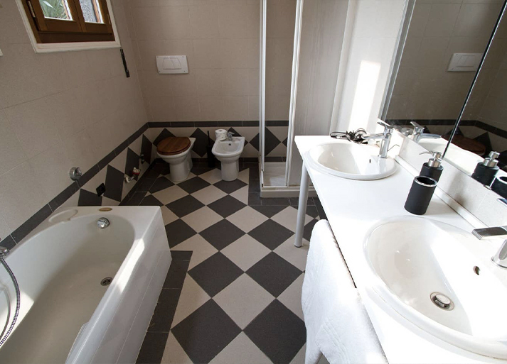 Il grande bagno, con due finestre, ha doppio lavandino, doccia e vasca da bagno separate. Nel bagno è collocata anche la lavatrice